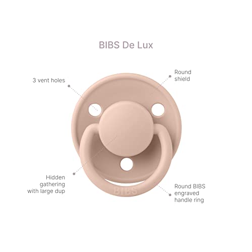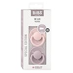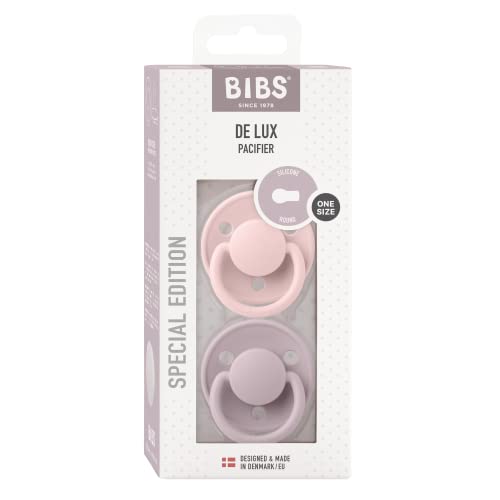 BIBS De Lux Soother 2-Pack, BPA Free Dummy Pacifier, Round Nipple. Silicone, Made in Denmark. 0-36 Months (Pack of 2), Blossom/Dusky Lilac