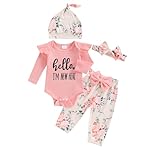 Infant Girl Fall 4Pcs Outfit Letter Print Long Sleeve Romper with Flower Pants and Hat Bow Headband Set