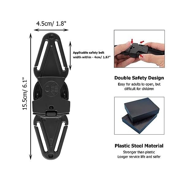 【Dimensions】Size – 15.5×4.5cm/ 6.1×1.8″(L×W). Applicable safety belt width within – 4cm/ 1.57″(Most seat belts). Color – Black. Package included – 2 pack car seat clips anti escape