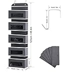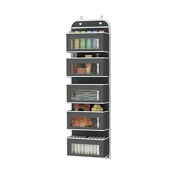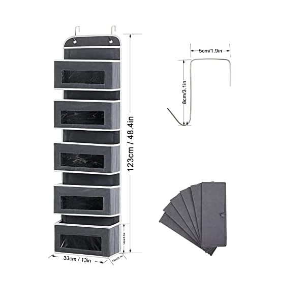 【Foldable & Space Saving Hanging Storage】 This over door handing organizer with 5 large storage pockets can be foldable and easy carrying. Just hang it on the door with the hook to create more vertical storage space. It can be used in nurseries, bathrooms, laundry room, utility rooms, hall and entryway closets and play rooms.