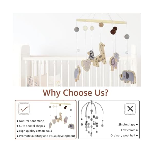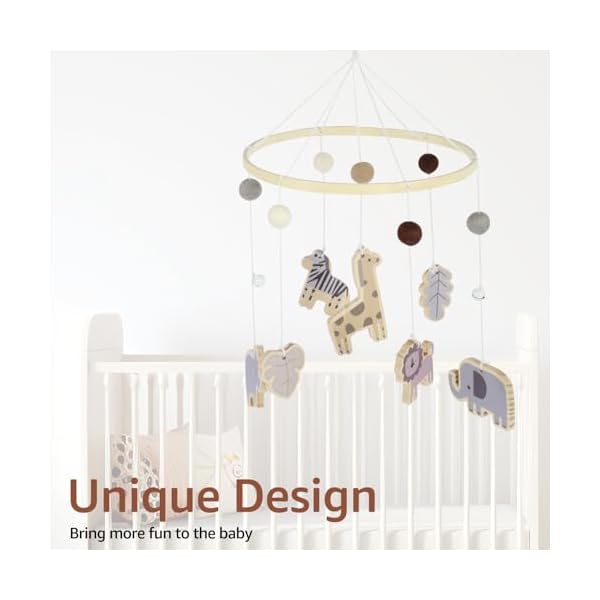 【Cute Designs】The forest model contains giraffe, zebra, lion, elephant, and leaves to create a safari themed room decoration. Panda model consists of panda, bamboo leaf decoration and cute shapes to attract baby’s attention. The cot mobile includes bells that will make a pleasant sound when it is slightly trembling or windy, helping the baby fall asleep.