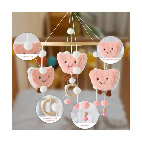 Early Development Toy:The baby cot mobile is designed with hand-crocheted watermelon dolls and ball decorations. Our crib mobility devices not only capture the baby’s attention and stimulate the baby’s curiosity, but also develop the baby’s visual ability to evaluate color.