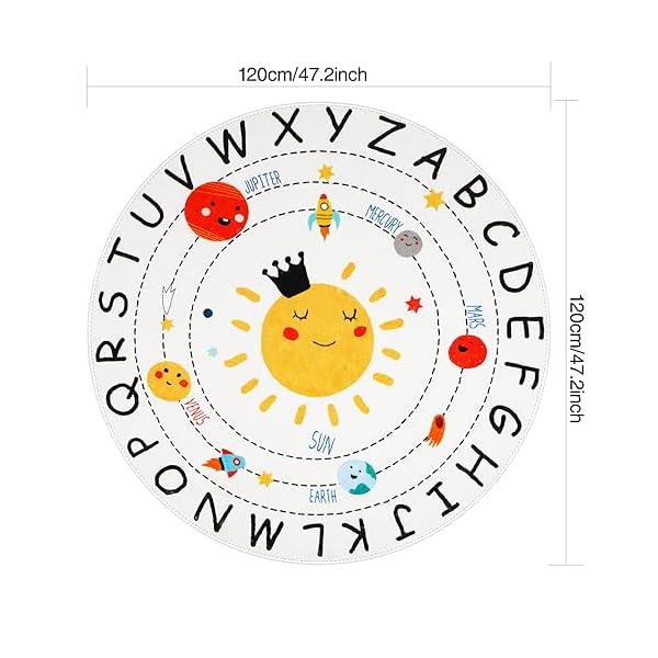【✦Solar system Rug with Alphabet Design✦】This 120cm circle kids play carpet is designed with cute solar system image and 26 letter patterns, cultivate baby’s recognition of the brief letters of the basic study,making this soft bedroom rug both a cartoon playmat and an educational and learning area rug.The cute elements and images of this soft baby crawl mat also make the children’s room a lively space, perfect for kids playroom decor, nursery decor and photography props.